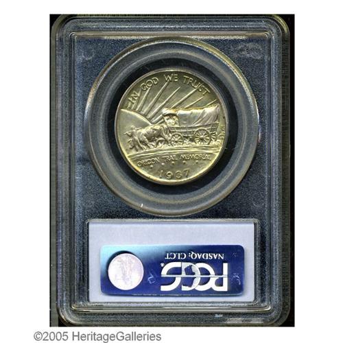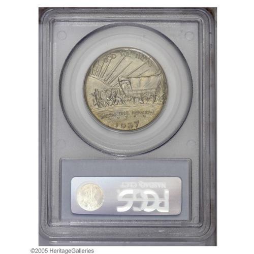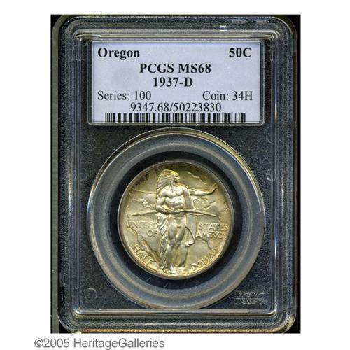 <B>1937-D<50C> Oregon MS68 PCGS.</B></I> An ivory and gold toned Superb Gem with additional iridescent toning. An extraordinary display. While studying the surfaces of this remarkable example, we hesitate only for a moment to consider what the single finer MS69 example must look like. Population: 35 in 68, 1 finer (10/05).