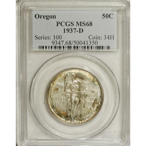 <B>1937-D 50C Oregon MS68 PCGS.</B></I> Few commemorative issues can be found in so high a grade at a price that is still relatively affordable. Silver-gray patina blankets the surfaces, with deep golden color scattered about the recesses of the obverse. A remarkable, fully original, carefully preserved Superb Gem. Population: 45 in 68, 1 finer (4/07).<BR><BR><b>Shipping:</b> Coins & Currency (<a target="_blank" href="http://www.heritageauctions.com/common/shipping.php">view shipping information</a>)