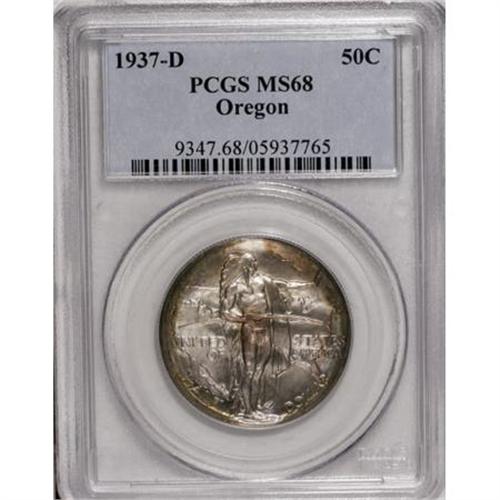 <B>1937-D 50C Oregon MS68 PCGS.</B></I> Boldly impressed with magnificent preservation and eye appeal to match. Subtle, yet lively mauve, rose, tan, and silver-blue patina shows occasional hints of iridescence. PCGS has certified just one finer example (1/08).<BR><BR><b>Shipping:</b> Coins & Currency (<a target="_blank" href="http://www.heritageauctions.com/common/shipping.php">view shipping information</a>)