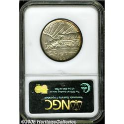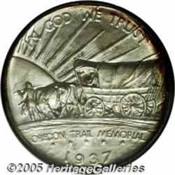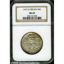 <B>1937-D 50C Oregon MS69 NGC.</B></I> This is one of the most magnificent Oregon Commems that we have ever handled, which is saying a lot since this type often comes attractive and well preserved. It is the toning that separates this coin from other Superb quality examples. The centers exhibit a predominately silver-gray and sky-blue appearance while the peripheries are a deep golden-russet-brown color. The same colors are seen on both the obverse and reverse. A fully struck and obviously well cared for example. Population: 1 in 69, 0 finer (2/05).