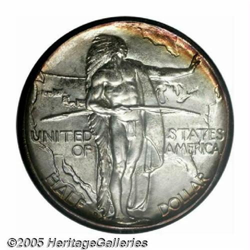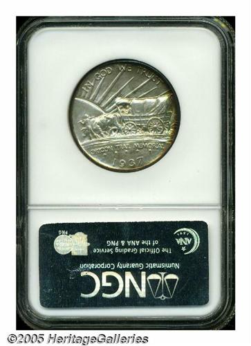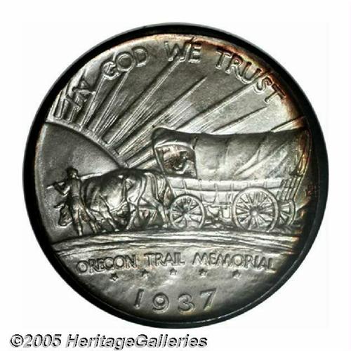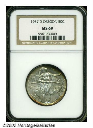 <B>1937-D<50C> Oregon MS69 NGC.</B></I> This is one of the most magnificent Oregon Commems that we have ever handled, which is saying a lot since this type often comes attractive and well preserved. It is the toning that separates this coin from other Superb quality examples. The centers exhibit a predominately silver-gray and sky-blue appearance while the peripheries are a deep golden-russet-brown color. The same colors are seen on both the obverse and reverse. A fully struck and obviously well cared for example. Population: 1 in 69, 0 finer (5/05).