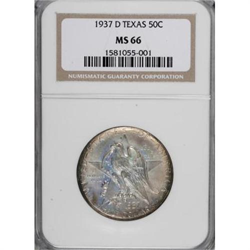 <B>1937-D 50C Texas MS66 NGC.</B></I> NGC Census: (400/68). PCGS Population (424/99). Mintage: 6,605. Numismedia Wsl. Price for NGC/PCGS coin in MS66: $380. (#9391)<BR><BR><b>Shipping:</b> Coins & Currency (<a target="_blank" href="http://www.heritageauctions.com/common/shipping.php">view shipping information</a>)