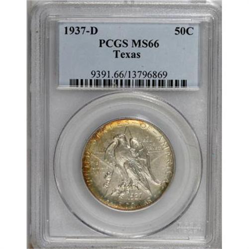 <B>1937-D 50C Texas MS66 PCGS.</B></I> PCGS Population (423/100). NGC Census: (400/68). Mintage: 6,605. Numismedia Wsl. Price for NGC/PCGS coin in MS66: $380. (#9391)<BR><BR><b>Shipping:</b> Coins & Currency (<a target="_blank" href="http://www.heritageauctions.com/common/shipping.php">view shipping information</a>)