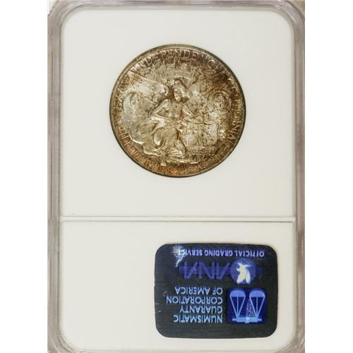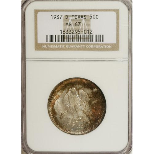 <B>1937-D 50C Texas MS67 NGC.</B></I> The obverse displays tan and crimson peripheral toning, while similar, mottled colors appear at the rims on the reverse. Small tendrils of toning reach into the complex reverse design, one which several commentators have suggested would look better as a monument than as one side of a coin. NGC has certified only three numerically finer examples (4/07).<BR><I>From The Cary & Cheryl Porter Collection.</B></I><BR><BR><b>Shipping:</b> Coins & Currency (<a target="_blank" href="http://www.heritageauctions.com/common/shipping.php">view shipping information</a>)