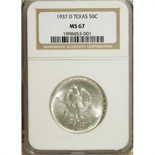 <B>1937-D 50C Texas MS67 NGC.</B></I> Exquisitely detailed with only occasional whispers of silver-gray patina. Both sides show powerful luster; the obverse, which shows rotational luster rather than the more typical "halo" luster, is particularly noteworthy. Census: 67 in 67, 3 finer (3/08).<BR><I>From The Silver Spur Collection.</B></I><BR><BR><b>Shipping:</b> Coins & Currency (<a target="_blank" href="http://www.heritageauctions.com/common/shipping.php">view shipping information</a>)