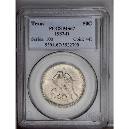 <B>1937-D 50C Texas MS67 PCGS.</B></I> An exquisite example with satiny silver luster on both sides. The surfaces are essentially brilliant with a hint of olive on the obverse and faint heather on the reverse. Population: 87 in 67, 2 finer (1/06).