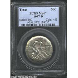 1937-D 50C Texas MS67 PCGS. Beautifully toned with bands of sea-green, orange-gold, and lavender patina. A lustrous and nearly pristine Superb Gem that is well struck on the often problematic hand and knee of the Winged Victory. Population: 49 in 67, 1 finer (10/02). Important notice: We expect to be auctioning lots at the rate of 200-250 per hour. Sometimes eBay Premier live bid software cannot keep up with that pace, so we strongly recommend that you place a realistic proxy bid now as insurance to avoid disappointment. Also please note that all Heritage/CAA lots purchased through eBay Premier carry a 20% Buyer's Premium. Please make sure you read the Terms and Conditions.
