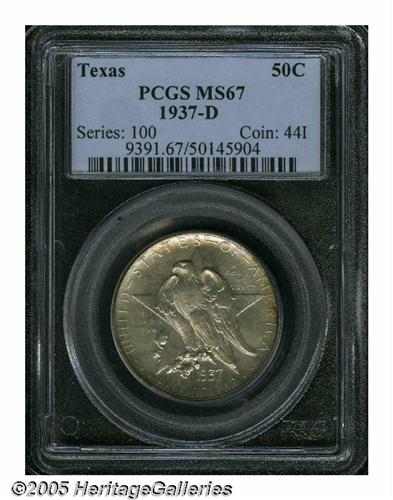 <B>1937-D<50C> Texas MS67 PCGS.</B></I> Highly lustrous surfaces are visited by faint golden-brown patina, imbued with faint ice-blue undertones. The design elements are sharply impressed, and have nice definition throughout. The surfaces are virtually pristine, revealing no significant marks. Population: 86 in 67, 2 finer (4/05).