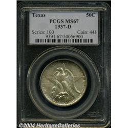 <table><tr><td><table><tr><td>1937-D 50C Texas MS67 PCGS. Russet speckles interspersed with light silver-gray toning on the obverse, while the reverse is light gray with subtle light blue undertones. The lustrous surfaces are seemingly devoid of contact marks. Population: 79 in 67, 2 finer (3/04). <BR><BR><B>Important notice:</B> Heritage usually auctions material at the rate of 200-250 lots per hour. On some occasions eBay Live bid software or the Internet may not be able to keep up with the pace of the auction. We recommend placing a realistic absentee bid now as insurance to avoid disappointment. Occasionally the auctioneer may eliminate or reject an eBay Live bid, and the auctioneer may also reopen a lot after the close of the eBay live bidding (usually because we missed an audience bid), and may reject your bid even if it shows you as the winning bidder. By bidding via eBay Live, you agree that Heritage may award the lot to another bidder at its sole discretion under the circumstances described above or any other reasonable circumstances. Since eBay bids are not shown to us until we open the lot on the floor, we treat those bids just like floor bids. In most cases the floor responds before the eBay bid is presented to us, due to Internet lag time, so for consistency we have made it a policy that floor bids are always considered first over tie eBay live bids. Also please note that all Heritage lots purchased through eBay Live carry a 20% Buyer's Premium. Please make sure you read the Terms and Conditions before you bid. <BR><BR><B>IMPORTANT ANNOUNCEMENT ABOUT RESERVES:</B> Heritage now divulges all reserves on its web site 7 days before every auction. If you want to know whether the reserve on this lot has been met, and if not, what the reserve amount is, please visit this lot page on the HeritageCoin.com web site, or email: bid@HeritageGalleries.com </span></font></td></tr></table></td></tr></table>