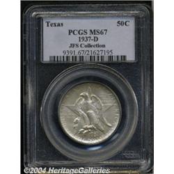 <B>1937-D<50C> Texas MS67 PCGS.</B></I> Pastel steel-blue and tan-gold colors embrace this lustrous and meticulously struck Superb Gem. Thorough inspection under a loupe fails to detect any remotely relevant contact. A superlative example of this scarcer issue. The 1937-dated Texas Halves were originally available only as a PDS set. Approximately 6,600 sets were sold, substantially fewer than the 1935 and 1936 PDS sets since a proliferation of Commemorative issues (many of which had marketing abuses) reduced collector interest. However, the controversies have long since subsided, and the lower mintage issues are now eagerly sought by specialists. Population: 82 in 67, 2 finer (6/04).<BR><I>From the JFS Collection, the #1 All-Time PCGS Registry Set.</B></I> <BR><BR><B>Important notice:</B> Heritage usually auctions material at the rate of 200-250 lots per hour. On some occasions eBay Live bid software or the Internet may not be able to keep up with the pace of the auction. We recommend placing a realistic absentee bid now as insurance to avoid disappointment. Occasionally the auctioneer may eliminate or reject an eBay Live bid, and the auctioneer may also reopen a lot after the close of the eBay live bidding (usually because we missed an audience bid), and may reject your bid even if it shows you as the winning bidder. By bidding via eBay Live, you agree that Heritage may award the lot to another bidder at its sole discretion under the circumstances described above or any other reasonable circumstances. Since eBay bids are not shown to us until we open the lot on the floor, we treat those bids just like floor bids. In most cases the floor responds before the eBay bid is presented to us, due to Internet lag time, so for consistency we have made it a policy that floor bids are always considered first over tie eBay live bids. Also please note that all Heritage lots purchased through eBay Live carry a 20% Buyer's Premium. Please make sure you read the Terms and Conditions before you bid. </span></font></tr></table></td></tr></table>