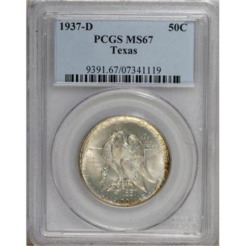 <B>1937-D 50C Texas MS67 PCGS.</B></I> PCGS Population (94/2). NGC Census: (65/3). Mintage: 6,605. Numismedia Wsl. Price for NGC/PCGS coin in MS67: $600. (#9391)<BR><BR><b>Shipping:</b> Coins & Currency (<a target="_blank" href="http://www.heritageauctions.com/common/shipping.php">view shipping information</a>\)