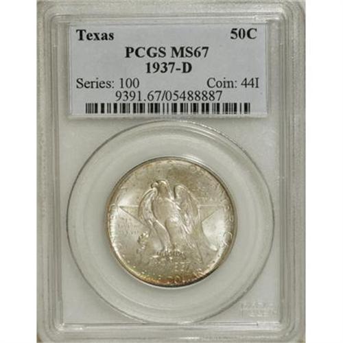 <B>1937-D 50C Texas MS67 PCGS.</B></I> PCGS Population (99/2). NGC Census: (65/3). Mintage: 6,605. Numismedia Wsl. Price for NGC/PCGS coin in MS67: $600. (#9391)<BR><BR><b>Shipping:</b> Coins & Currency (<a target="_blank" href="http://www.heritageauctions.com/common/shipping.php">view shipping information</a>)