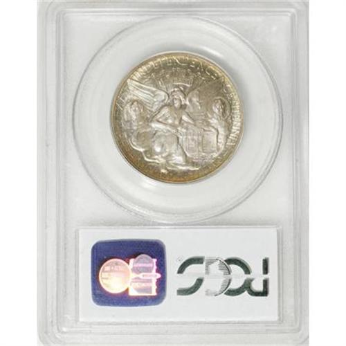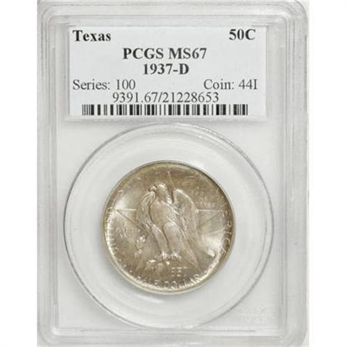 <B>1937-D 50C Texas MS67 PCGS.</B></I> One of just 6,605 examples coined for this later-date Texas issue, beautifully toned with bands of sea-green, orange-gold, and lavender patina. This shining piece exhibits strong definition on the often-weak figure of Victory. PCGS has graded just two finer representatives (10/07).<BR><BR><b>Shipping:</b> Coins & Currency (<a target="_blank" href="http://www.heritageauctions.com/common/shipping.php">view shipping information</a>)