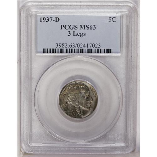 <B>1937-D<5C> Three-Legged MS63 PCGS.</B></I> Along with the 1918/7-D and the 1916/1916, the 1937-D is the third most popular variety in the Buffalo nickel series. As one might imagine from the late date of issue, it is by far the most available of the three varieties and is occasionally offered at public auction in the better grades of Mint State. This is an especially well struck example that has lovely, satin-like mint luster. Each side is covered with pale lilac toning with a touch of olive over the highpoints.<BR><I>From The Ron W. Keeney Collection, Part Two.</B></I>