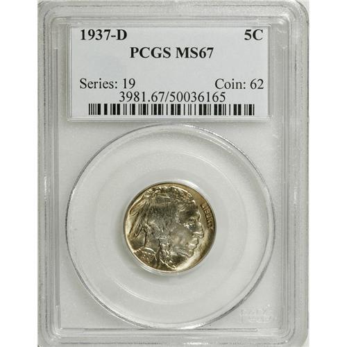 1937-D 5C MS67 PCGS. A highly lustrous Superb Gem spec