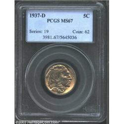 <TR><TD width="100%"><TABLE cellSpacing=1 cellPadding=3 width="100%" border=0><TBODY><TR><TD width="100%" bgColor=#79735c><FONT face=arial color=#ffffff size=3><B>Description</B> </FONT></TD></TR><TR><TD width="100%" bgColor=#ffffff><FONT face=arial size=2><B>1937-D 5C MS67 PCGS.</B></I> Rich golden color blankets each side of this late date Buffalo nickel. </FONT></TD></TR></TBODY></TABLE></TD></TR></TBODY></TABLE><BR><A name=PricesRealized></A><TABLE cellSpacing=0 cellPadding=0 width="100%" bgColor=#000000 border=0><TBODY><TR><TD width="100%"><TABLE cellSpacing=1 cellPadding=3 width="100%" border=0><TBODY><TR><TD width="100%" bgColor=#79735c><A name=PR><FONT face=arial color=#ffffff size=3><B>Previous Prices from Heritage Auctions</B> </FONT></A></TD></TR><TR><TD bgColor=#f6f6ed><TABLE cellSpacing=0 cellPadding=0 width="100%" border=1><TBODY><TR><TD align=middle width="33%"><B>Date</B></TD><TD align=middle width="33%"><B>Service</B></TD><TD align=middle width="33%"><B>Price</B></TD></TR><TR bgColor=whitesmoke><TD width="33%"><B>06/17/2003</B></TD><TD width="33%">PCGS</TD><TD width="33%">$1,099.40</TD></TR><TR bgColor=whitesmoke><TD width="33%"><B>06/17/2003</B></TD><TD width="33%">PCGS</TD><TD width="33%">$1,099.40</TD></TR><TR bgColor=whitesmoke><TD width="33%"><B>06/17/2003</B></TD><TD width="33%">PCGS</TD><TD width="33%">$1,099.40</TD></TR><TR bgColor=whitesmoke><TD width="33%"><B>01/05/2001</B></TD><TD width="33%">PCGS</TD><TD width="33%">$1,006.25</TD></TR><TR bgColor=whitesmoke><TD width="33%"><B>01/05/2001</B></TD><TD width="33%">PCGS</TD><TD width="33%">$1,006.25</TD></TR><TR bgColor=whitesmoke><TD width="33%"><B>05/05/2000</B></TD><TD width="33%">PCGS</TD><TD width="33%">$948.75</TD></TR><TR bgColor=whitesmoke><TD width="33%"><B>05/05/2000</B></TD><TD width="33%">PCGS</TD><TD width="33%">$948.75</TD></TR><TR bgColor=whitesmoke><TD width="33%"><B>05/05/2000</B></TD><TD width="33%">PCGS</TD><TD width="33%">$948.75</TD></TR><TR bgColor=whitesmoke><TD width="33%"><B>06/10/2000</B></TD><TD width="33%">PCGS</TD><TD width="33%">$833.75</TD></TR><TR bgColor=whitesmoke><TD width="33%"><B>06/10/2000</B></TD><TD width="33%">PCGS</TD><TD width="33%">$833.75</TD></TR><TR bgColor=whitesmoke><TD width="33%"><B>06/01/2000</B></TD><TD width="33%">PCGS</TD><TD width="33%">$1,150.00</TD></TR><TR bgColor=whitesmoke><TD width="33%"><B>06/01/2000</B></TD><TD width="33%">PCGS</TD><TD width="33%">$1,150.00</TD></TR><TR bgColor=whitesmoke><TD width="33%"><B>06/01/2000</B></TD><TD width="33%">PCGS</TD><TD width="33%">$1,150.00</TD></TR><TR bgColor=whitesmoke><TD width="33%"><B>03/01/2003</B></TD><TD width="33%">PCGS</TD><TD width="33%">$2,875.00</TD></TR><TR bgColor=whitesmoke><TD width="33%"><B>03/01/2003</B></TD><TD width="33%">PCGS</TD><TD width="33%">$2,875.00</TD></TR><TR bgColor=whitesmoke><TD width="33%"><B>03/23/2003</B></TD><TD width="33%">PCGS</TD><TD width="33%">$1,150.00</TD></TR><TR bgColor=whitesmoke><TD width="33%"><B>03/23/2003</B></TD><TD width="33%">PCGS</TD><TD width="33%">$1,150.00</TD></TR><TR bgColor=whitesmoke><TD width="33%"><B>03/23/2003</B></TD><TD width="33%">PCGS</TD><TD width="33%">$1,150.00</TD></TR><TR bgColor=whitesmoke><TD width="33%"><B>05/03/2003</B></TD><TD width="33%">PCGS</TD><TD width="33%">$1,092.50</TD></TR><TR bgColor=whitesmoke><TD width="33%"><B>05/03/2003</B></TD><TD width="33%">PCGS</TD><TD width="33%">$1,092.50</TD></TR><TR bgColor=whitesmoke><TD width="33%"><B>05/03/2003</B></TD><TD width="33%">PCGS</TD><TD width="33%">$1,265.00</TD></TR><TR bgColor=whitesmoke><TD width="33%"><B>05/03/2003</B></TD><TD width="33%">PCGS</TD><TD width="33%">$1,265.00</TD></TR><TR bgColor=whitesmoke><TD width="33%"><B>05/03/2003</B></TD><TD width="33%">PCGS</TD><TD width="33%">$1,265.00</TD></TR><TR bgColor=whitesmoke><TD width="33%"><B>08/14/2001</B></TD><TD width="33%">NGC</TD><TD width="33%">$480.00</TD></TR><TR bgColor=whitesmoke><TD width="33%"><B>08/14/2001</B></TD><TD width="33%">NGC</TD><TD width="33%">$480.00</TD></TR><TR bgColor=whitesmoke><TD width="33%"><B>01/02/2001</B></TD><TD width="33%">NGC</TD><TD width="33%">$500.00</TD></TR><TR bgColor=whitesmoke><TD width="33%"><B>01/02/2001</B></TD><TD width="33%">NGC</TD><TD width="33%">$500.00</TD></TR><TR bgColor=whitesmoke><TD width="33%"><B>01/02/2001</B></TD><TD width="33%">NGC</TD><TD width="33%">$500.00</TD></TR><TR bgColor=whitesmoke><TD width="33%"><B>10/24/2000</B></TD><TD width="33%">NGC</TD><TD width="33%">$500.00</TD></TR><TR bgColor=whitesmoke><TD width="33%"><B>10/24/2000</B></TD><TD width="33%">NGC</TD><TD width="33%">$500.00</TD></TR><TR bgColor=whitesmoke><TD width="33%"><B>03/01/2003</B></TD><TD width="33%">NGC</TD><TD width="33%">$552.00</TD></TR><TR bgColor=whitesmoke><TD width="33%"><B>03/01/2003</B></TD><TD width="33%">NGC</TD><TD width="33%">$552.00</TD></TR><TR bgColor=whitesmoke><TD width="33%"><B>03/01/2003</B></TD><TD width="33%">NGC</TD><TD width="33%">$552.00</TD></TR></TBODY></TABLE></TD></TR><TR><TD bgColor=#ffffff><FONT face=arial size=1 ?>PLEASE NOTE: All prices realized reflect the final hammer price PLUS the buyer's premium in auctions that charge a buyer's premium. Each item has a notation at the top of the listing indicating whether that lot included a buyer's premium. Example: A item that sells with a final hammer price of $100 and a 20% buyer's premium will display with a price realized of $120. All information listed is intended to be as accurate as possible, but errors are possible. Please use this guide carefully and inform us of any inaccuracies. </FONT></TD></TR></TBODY></TABLE></TD></TR></TBODY></TABLE><BR><TABLE cellSpacing=0 cellPadding=0 width="100%" bgColor=#000000 border=0><TBODY><TR><TD width="100%"><TABLE cellSpacing=1 cellPadding=3 width="100%" border=0><TBODY><TR><TD width="100%" bgColor=#79735c colSpan=6><FONT face=arial color=#ffffff size=3><B>Price Guide*</B> </FONT></TD></TR><TR bgColor=#f6f6ed><TD align=middle><B>Grade</B> </TD><TD align=middle><B>Coin World<BR>