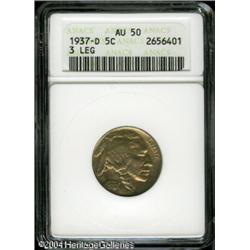 1937-D 5C Three-Legged AU50 ANACS. Bright steel-gr <B>1937-D 5C Three-Legged AU50 ANACS.</B></I> Bright steel-gray surfaces that display hints of pastel-apricot toning here and there. Unusually sharp for this often weak issue. <BR><BR><B>Important notice:</B> Heritage usually auctions material at the rate of 200-250 lots per hour. On some occasions eBay Live bid software or the Internet may not be able to keep up with the pace of the auction. We recommend placing a realistic absentee bid now as insurance to avoid disappointment. Occasionally the auctioneer may eliminate or reject an eBay Live bid, and the auctioneer may also reopen a lot after the close of the eBay live bidding (usually because we missed an audience bid), and may reject your bid even if it shows you as the winning bidder. By bidding via eBay Live, you agree that Heritage may award the lot to another bidder at its sole discretion under the circumstances described above or any other reasonable circumstances. Since eBay bids are not shown to us until we open the lot on the floor, we treat those bids just like floor bids. In most cases the floor responds before the eBay bid is presented to us, due to Internet lag time, so for consistency we have made it a policy that floor bids are always considered first over tie eBay live bids. Also please note that all Heritage lots purchased through eBay Live carry a 20% Buyer's Premium. Please make sure you read the Terms and Conditions before you bid. This lot is being auctioned in conjunction with a live floor auction by Heritage Galleries & Auctioneers. All final auction and invoice information will be supplied by Heritage Galleries & Auctioneers, and all other information should be considered preliminary. Lot:5612