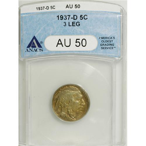 <B>1937-D 5C Three-Legged AU50 ANACS.</B></I> FS-020.2. Golden-brown and steel-gray toning envelops this satiny and lightly abraded key date nickel. The missing leg and the trail of die dots beneath the flank confirm the highly popular variety.<BR><BR><b>Shipping:</b> Coins & Currency (<a target="_blank" href="http://www.heritageauctions.com/common/shipping.php">view shipping information</a>)