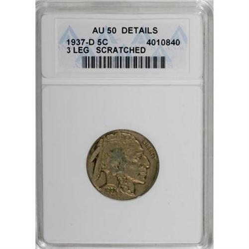 <B>1937-D 5C Three-Legged--Scratched--ANACS. AU50 Details.</B></I> FS-020.2. Light golden-brown with a blush of gunmetal-blue on the obverse center. A diagonal mark on the bison near the tail seems minor given the "Scratched" designation.<BR><BR><B>Coin Engraver:</B> James E. Fraser<BR><BR><b>Shipping:</b> Coins & Currency (<a target="_blank" href="http://www.heritageauctions.com/common/shipping.php">view shipping information</a>)