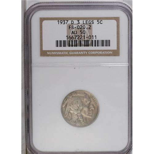 1937-D 5C Three-Legged AU50 NGC. FS-020.2. Dashes of a