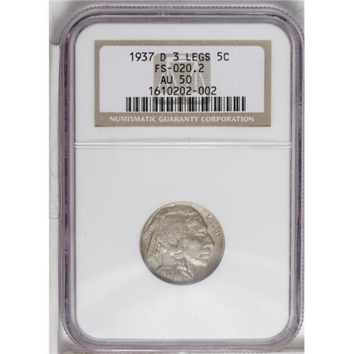 1937-D 5C Three-Legged AU50 NGC. FS-020.2. Slate-gray