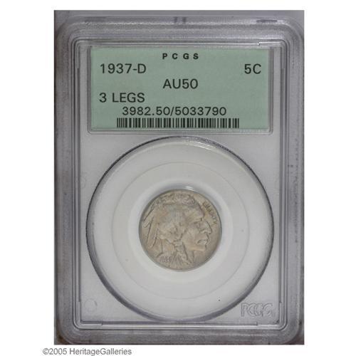 1937-D 5C Three-Legged AU50 PCGS. Always demanded, thi 1937-D[5C] Three-Legged AU50 PCGS.
