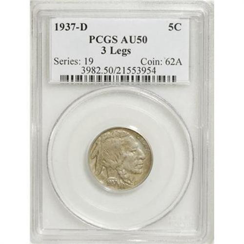 <B>1937-D 5C Three-Legged AU50 PCGS.</B></I> A dusky cloud-gray and olive-tan example of this popular Buffalo nickel variety, lightly worn with pleasing detail overall. The light, scattered marks present on each side have minimal impact on the coin's visual appeal.<BR><BR><B>Coin Engraver:</B> James E. Fraser<BR><BR><b>Shipping:</b> Coins & Currency (<a target="_blank" href="http://www.heritageauctions.com/common/shipping.php">view shipping information</a>)