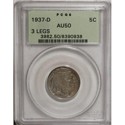 <B>1937-D 5C Three-Legged AU50 PCGS.</B></I> . PCGS Population (413/2423). NGC Census: (137/3035). Mintage: 17,826,000. Numismedia Wsl. Price for NGC/PCGS coin in AU50: $1,100. (#3982)<BR><BR><B>Coin Engraver:</B> James E. Fraser<BR><BR><b>Shipping:</b> Coins & Currency (<a target="_blank" href="http://www.heritageauctions.com/common/shipping.php">view shipping information</a>)