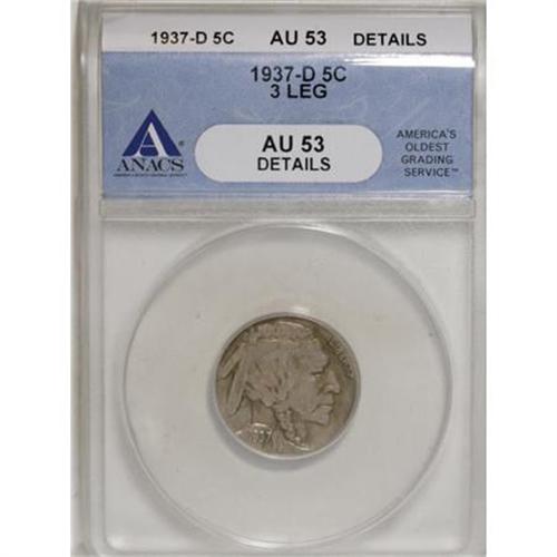 <B>1937-D 5C Three-Legged ANACS. AU53 Details.</B></I> ANACS omits an impairment from the insert, but the slate-gray appearance suggests a mild past cleaning. The devices display moderate wear. A popular key date.<BR><BR><B>Coin Engraver:</B> James E. Fraser<BR><BR><b>Shipping:</b> Coins & Currency (<a target="_blank" href="http://www.heritageauctions.com/common/shipping.php">view shipping information</a>)