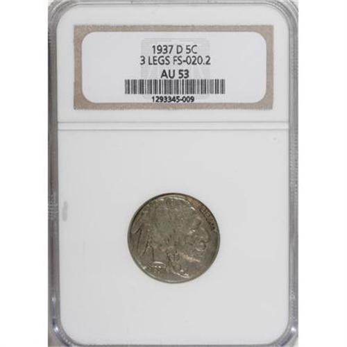 <B>1937-D 5C Three-Legged AU53 NGC.</B></I> FS-020.2. Nicely detailed and with plenty of luster for the grade, this is an attractive AU example of the famed Three-Legged Buffalo nickel. Lightly worn, with evidence of minor die erosion and a few small marks on the reverse. <BR><BR><b>Shipping:</b> Coins & Currency (<a target="_blank" href="http://www.heritageauctions.com/common/shipping.php">view shipping information</a>)
