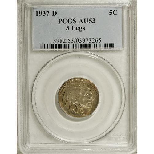 <B>1937-D 5C Three-Legged AU53 PCGS.</B></I> FS-020.2. This famous variety was created by overzealous die polishing by a Mint employee. This is a pleasing AU example with attractive coloration and generally smooth surfaces.<BR><BR><b>Shipping:</b> Coins & Currency (<a target="_blank" href="http://www.heritageauctions.com/common/shipping.php">view shipping information</a>)