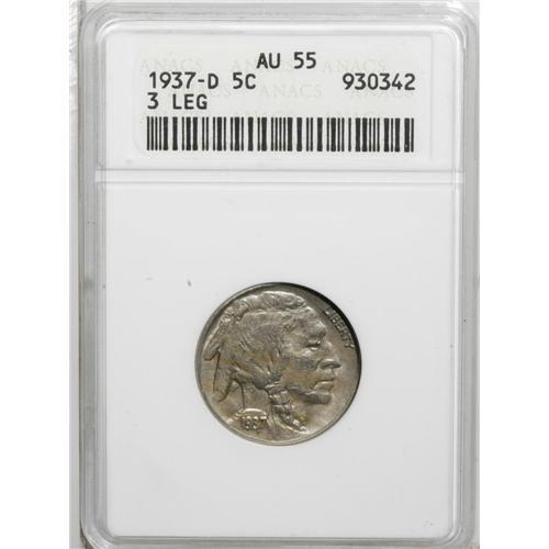 1937-D 5C Three-Legged AU55 ANACS. The still-lustrous