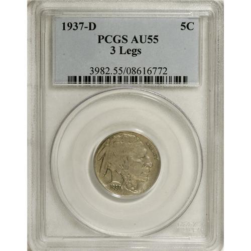 <B>1937-D 5C Three-Legged AU55 PCGS.</B></I> A dove-gray example of this perennial collector favorite. Sharply struck for the variety, and the hipbone shows only slight wear. Free from mentionable marks.<BR><BR><b>Shipping:</b> Coins & Currency (<a target="_blank" href="http://www.heritageauctions.com/common/shipping.php">view shipping information</a>)