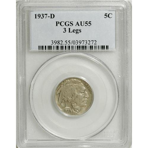 <B>1937-D 5C Three-Legged AU55 PCGS.</B></I> A modestly worn and subtly lustrous representative of this ever-popular variety. Each side displays considerable die erosion, and the lumps below the bison's body are weak, though visible. The mauve-gray surfaces have a hint of sky-blue.<BR><I>From The Greg Southward Collection.</B></I><BR><BR><b>Shipping:</b> Coins & Currency (<a target="_blank" href="http://www.heritageauctions.com/common/shipping.php">view shipping information</a>)