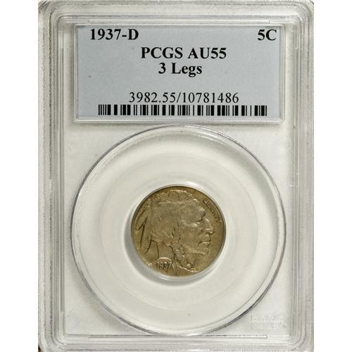 <B>1937-D 5C Three-Legged AU55 PCGS.</B></I> Minor highpoint wear is present on each side of this well struck error. The lightly marked greenish-gold surfaces have pink and brown overtones.<BR><BR><b>Shipping:</b> Coins & Currency (<a target="_blank" href="http://www.heritageauctions.com/common/shipping.php">view shipping information</a>)