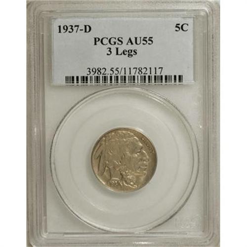 <B>1937-D 5C Three-Legged AU55 PCGS.</B></I> Softly struck from eroded dies, this Three-Legged nickel nonetheless displays just a touch of actual wear on the highpoints. The usual reverse diagnostics accompany the missing foreleg. A desirable Choice AU example.<BR><BR><B>Coin Engraver:</B> James E. Fraser<BR><BR><b>Shipping:</b> Coins & Currency (<a target="_blank" href="http://www.heritageauctions.com/common/shipping.php">view shipping information</a>)