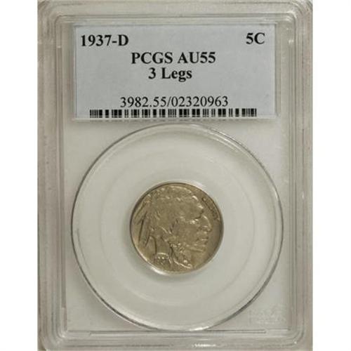 <B>1937-D 5C Three-Legged AU55 PCGS.</B></I> A silver-gray, briefly circulated representative that offers an unusually sharp obverse and reverse, though this variant's characteristic die erosion is present. Highly appealing with only minor wear and marks on the highpoints of the devices.<BR><BR><B>Coin Engraver:</B> James E. Fraser<BR><BR><b>Shipping:</b> Coins & Currency (<a target="_blank" href="http://www.heritageauctions.com/common/shipping.php">view shipping information</a>)