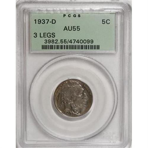 <B>1937-D 5C Three-Legged AU55 PCGS.</B></I> A medley of lilac, violet, and gold patina adhere to the remarkably clean surfaces of this Choice AU 3 Legs variety. Housed in a green-label holder.<BR><BR><B>Coin Engraver:</B> James E. Fraser<BR><BR><b>Shipping:</b> Coins & Currency (<a target="_blank" href="http://www.heritageauctions.com/common/shipping.php">view shipping information</a>)