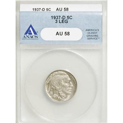 <B>1937-D 5C Three-Legged AU58 ANACS.</B></I> Light golden-gray color resides on surfaces that possess a good amount of luster, and exhibit well struck design elements. A couple of tiny reverse flecks are noted.<BR><BR><B>Coin Engraver:</B> James E. Fraser<BR><BR><b>Shipping:</b> Coins & Currency (<a target="_blank" href="http://www.heritageauctions.com/common/shipping.php">view shipping information</a>)