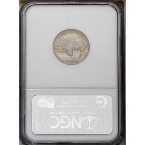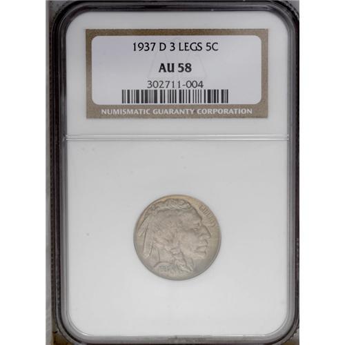 <B>1937-D<5C> Three-Legged AU58 NGC.</B></I> FS-020.2. Russet-gold and olive-gray toning are intermingled over both sides of this satiny near-Mint example. The striking details are better defined than usual, although minor striking weakness and a trace of wear are noted on the bison's highpoints. No distracting marks occur on either obverse or reverse.