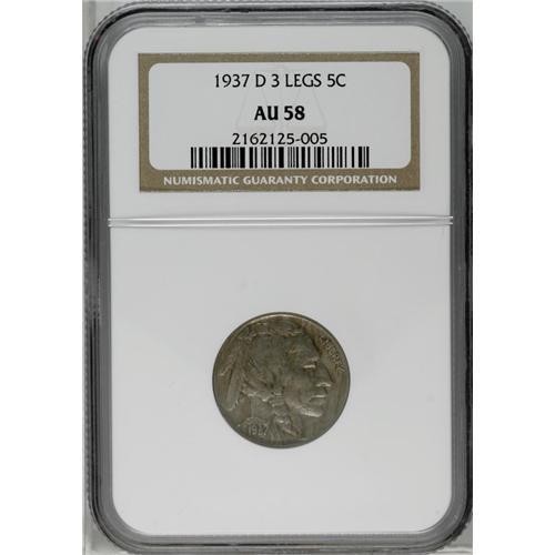 <B>1937-D<5C> Three-Legged AU58 NGC.</B></I> FS-020.2. Slight highpoint wear results in a near-Mint grade for this somewhat subdued iron-gray example. Faint horizontal toning streaks occur on each side of the coin. A nearly abrasion-free representative of this ever-popular variety.