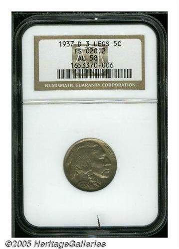 <B>1937-D<5C> Three-Legged AU58 NGC.</B></I> FS-20.2. Attractive near-Mint survivor that retains traces of golden luster in its peach-violet surfaces. Some tiny contact marks are noted, but this piece is exceedingly well preserved.