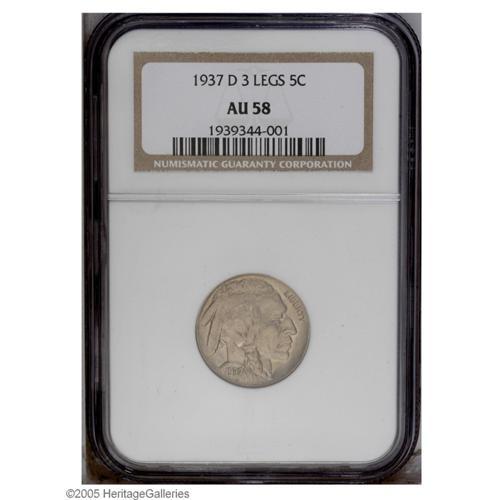 <B>1937-D<5C> Three-Legged AU58 NGC.</B></I> Rose-gray surfaces that show little actual wear, but display several faint pinscratches and mild die erosion (as struck). A minor contact mark rests near the center of the bison's torso, and a small planchet lamination (as produced) is evident on the Indian's cheekbone. A pleasing near-Mint example of this immensely popular variety.