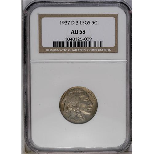 <B>1937-D<5C> Three-Legged AU58 NGC.</B></I> This is a wonderful example of the popular Three-Legged die state of the '37-D Buffalo nickel. Just a trace of wear is present with lustrous gray surfaces and peripheral gold toning.