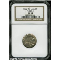 <B>1937-D<5C> Three-Legged AU58 NGC.</B></I> FS-020.2. A crisply struck silver-gray near-Mint example of this popular <I>Guide Book</B></I> variety. The lower right obverse has a hint of tan patina, and the satiny luster is unencumbered. A few wispy slide marks near the bison's legs deny an Uncirculated grade. <BR><BR><B>Important notice:</B> Heritage usually auctions material at the rate of 200-250 lots per hour. On some occasions eBay Live bid software or the Internet may not be able to keep up with the pace of the auction. We recommend placing a realistic absentee bid now as insurance to avoid disappointment. Occasionally the auctioneer may eliminate or reject an eBay Live bid, and the auctioneer may also reopen a lot after the close of the eBay live bidding (usually because we missed an audience bid), and may reject your bid even if it shows you as the winning bidder. By bidding via eBay Live, you agree that Heritage may award the lot to another bidder at its sole discretion under the circumstances described above or any other reasonable circumstances. Since eBay bids are not shown to us until we open the lot on the floor, we treat those bids just like floor bids. In most cases the floor responds before the eBay bid is presented to us, due to Internet lag time, so for consistency we have made it a policy that floor bids are always considered first over tie eBay live bids. Also please note that all Heritage lots purchased through eBay Live carry a 20% Buyer's Premium. Please make sure you read the Terms and Conditions before you bid. </span></font></tr></table></td></tr></table>
