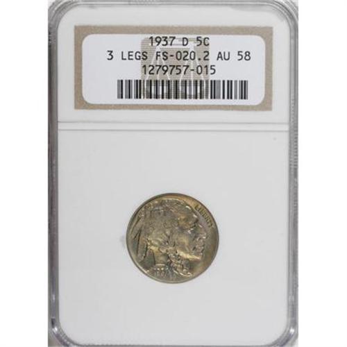 <B>1937-D 5C Three-Legged AU58 NGC.</B></I> Just a hint of highpoint friction is seen on each side of this beautiful Three-Legged Buffalo nickel. Unlike most seen, this piece has concentric rings of iridescent toning around the margins and light golden-rose centers. A few shallow field marks are present, but these are noticeable only with magnification.<BR><BR><b>Shipping:</b> Coins & Currency (<a target="_blank" href="http://www.heritageauctions.com/common/shipping.php">view shipping information</a>)