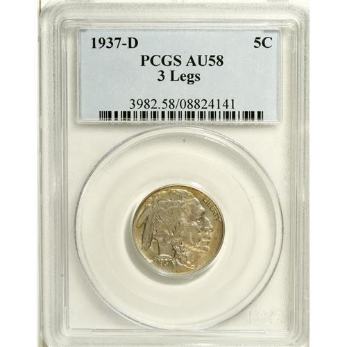<B>1937-D 5C Three-Legged AU58 PCGS.</B></I> FS-020.2. Well detailed for this universally recognized oddity, with delicate golden and steel-blue highlights on each side. A couple of light scratches from brief circulation are noted on the bison.<BR><BR><b>Shipping:</b> Coin/Currency (<a target="_blank" href="http://www.heritageauctions.com/common/shipping.php">view shipping information</a>)