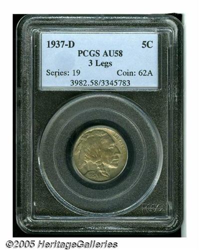 <B>1937-D<5C> Three-Legged AU58 PCGS.</B></I> Temptingly close to mint state quality on this ever-popular variety. The devices are better struck than most seen, and medium gray-golden patina covers each side.