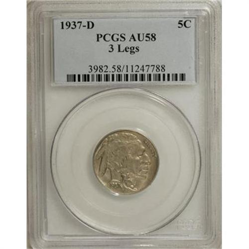 <B>1937-D 5C Three-Legged AU58 PCGS.</B></I> Satin luster penetrates this light golden-brown and slate-gray near-Mint nickel. The flank of the bison has a few faint slide marks, but this is otherwise a splendid example of the eagerly sought Three-Legged variety.<BR><BR><B>Coin Engraver:</B> James E. Fraser<BR><BR><b>Shipping:</b> Coins & Currency (<a target="_blank" href="http://www.heritageauctions.com/common/shipping.php">view shipping information</a>)