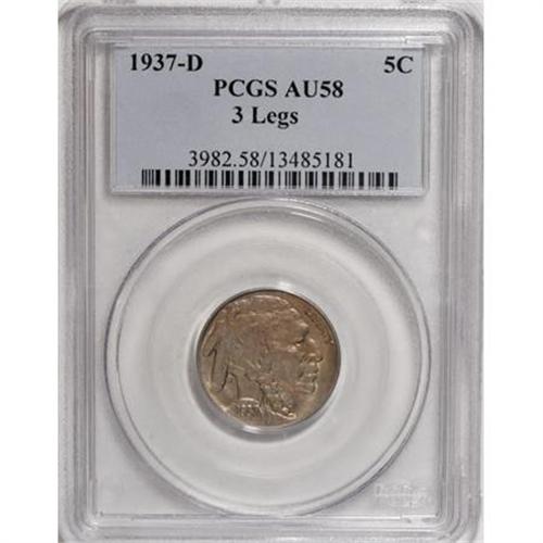 <B>1937-D 5C Three-Legged AU58 PCGS.</B></I> FS-020.2. A pleasing gray-gold color, with light pink accents, is seen on both sides of this nearly Mint State example. A very appealing example of this always-popular variety that is more appealing than many Mint State examples. <BR><BR><B>Coin Engraver:</B> James E. Fraser<BR><BR><b>Shipping:</b> Coins & Currency (<a target="_blank" href="http://www.heritageauctions.com/common/shipping.php">view shipping information</a>)